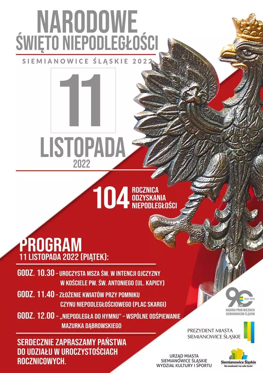Prezydent Miasta Siemianowice Śląskie zaprasza na uroczyste obchody Narodowego Święta Niepodległości, które odbędą się w naszym mieście.