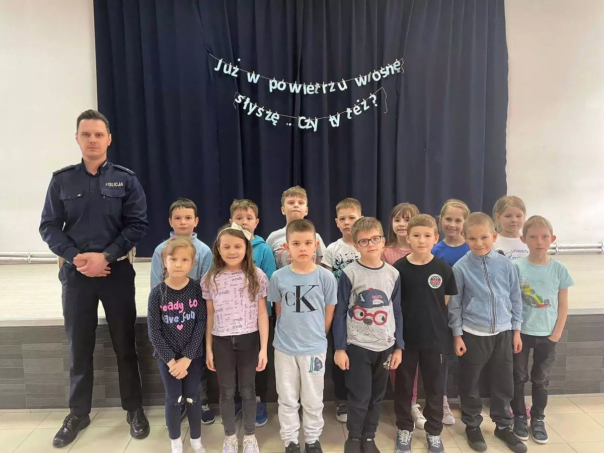 Policjant z ruchu drogowego odwiedził Szkołę Podstawową nr 6, gdzie przeprowadził prelekcję o bezpieczeństwie w ruchu drogowym z pierwszoklasistami.