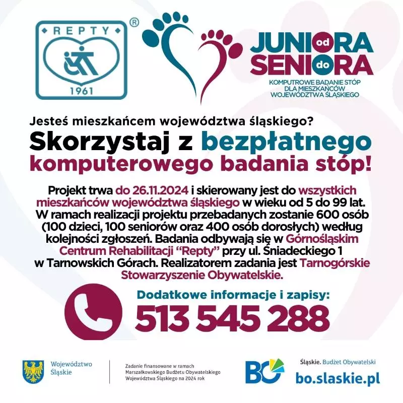 Tarnogórskie Stowarzyszenie Obywatelskie realizuje projekt „Od Juniora do Seniora – Komputerowe badanie stóp dla mieszkańców województwa śląskiego„ finansowany w ramach Marszałkowskiego Budżetu Obywatelskiego Województwa Śląskiego na rok 2024. W ramach projektu mieszkańcy województwa śląskiego skorzystać mogą z bezpłatnych konsultacji podologicznych z wykorzystaniem nowoczesnego podoskopu.