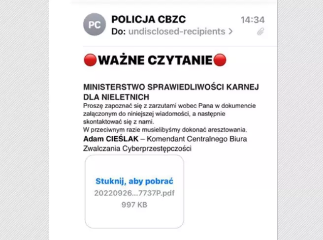 W celu uwiarygodnienia swojej wiadomości przestępcy podpisują się jako Komendant Centralnego Biura Zwalczania Cyberprzestępczości – Adam Cieślak.