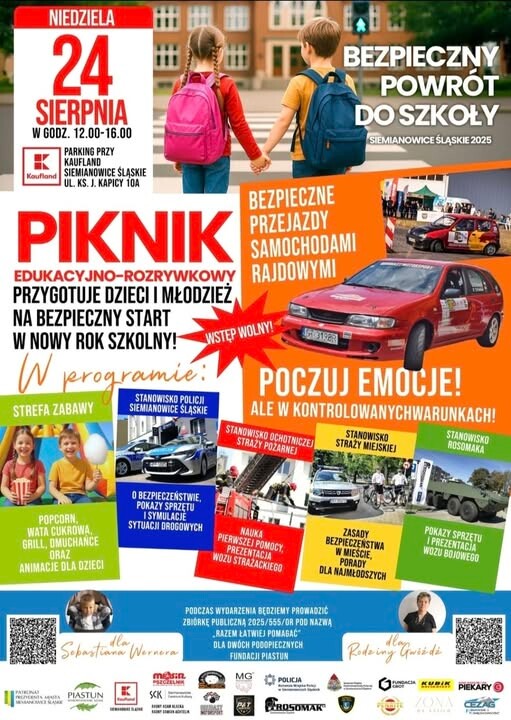 W niedzielę, 24 sierpnia, w godzinach od 12.00 do 16.00 na parkingu przy sklepie Kaufland przy ul. Kapicy 10a odbędzie się Piknik Rodzinny pod hasłem „Bezpieczny powrót do szkoły”. Wydarzenie organizuje Fundacja „Piastun – Wyrównywanie Szans”.