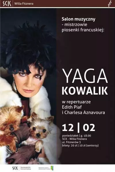 12 lutego o godzinie 18.00 w Siemianowickim Centrum Kultury – Willi Fitznera odbędzie się koncert „Mistrzowie piosenki francuskiej – Yaga Kowalik – Piaf, Greko, Aznavour". Bilety w cenie 20 złotych. Seniorzy 10 zł. dostępne są w kasach SCK i on-line na www.bilety.siemck.pl