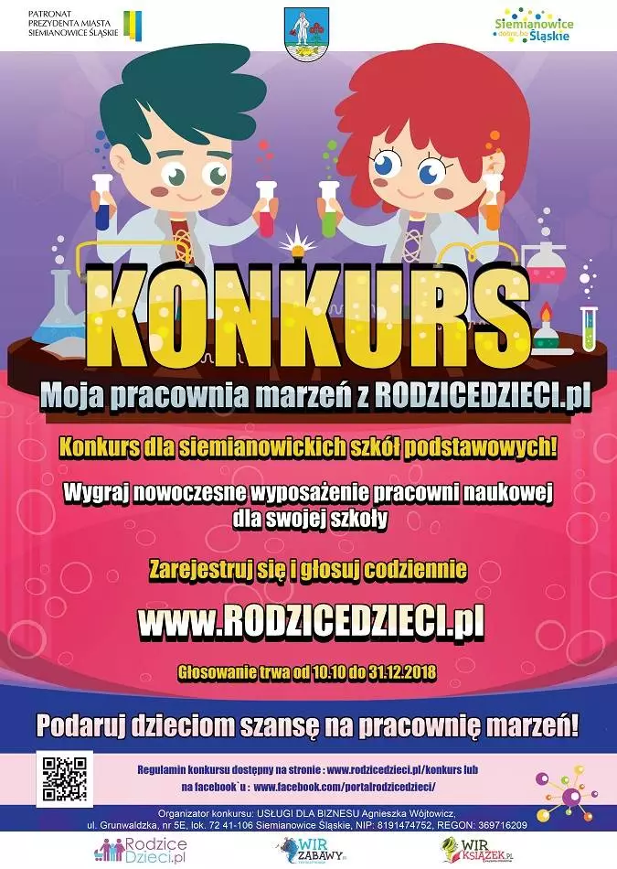 Właściciel portalu internetowego www.rodzicedzieci.pl zaprasza wszystkie Szkoły Podstawowe z Siemianowic Śląskich do wzięcia udziału w konkursie „Moja pracownia marzeń z RODZICEDZIECI.pl”. W drodze konkursu wyłonione zostaną trzy szkoły, które w zależności od zajętego miejsca otrzymają odpowiednio 5000, 2000 lub 1000zł na wyposażenie pracowni dydaktycznych i zakup pomocy naukowych.