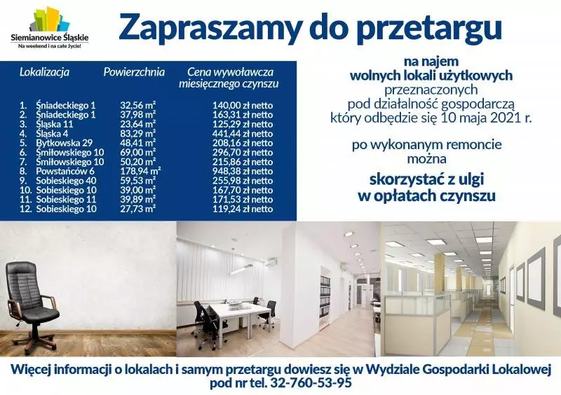 Szczegółowe informacje oraz ogłoszenia przetargowe znajdą Państwo w Biuletynie Informacji Publicznej oraz na stronie Invest in Siemianowice Śląskie. W przypadku pytań prosimy o kontakt z Pracownikami Wydziału Gospodarki Lokalowej, tel. (32) 760-53-95.