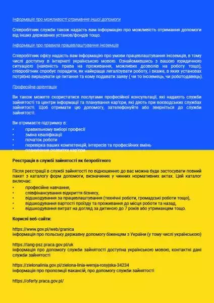 Obywatele Ukrainy mogą skorzystać z pomocy powiatowego urzędu pracy obejmującej wsparcie w znalezieniu pracy. Zaprasza się do siedziby Urzędu lub kontaktu telefonicznego.