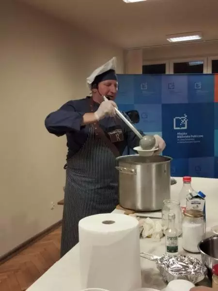 Spotkanie okazało się wyjątkowe nie tylko przez nietypową formę, ale także otwartość kucharza. Chętnie dzielił się swoją rozległą wiedzą odnośnie gotowania, przy okazji nie szczędząc anegdotek. Na koniec spotkania zainteresowani mogli zakupić książkę z przepisami oraz zdobyć autograf z dedykacją! Bez wątpienia smakowite spotkanie z Remigiuszem Rączką było rarytasem w naszym bibliotecznym menu.
