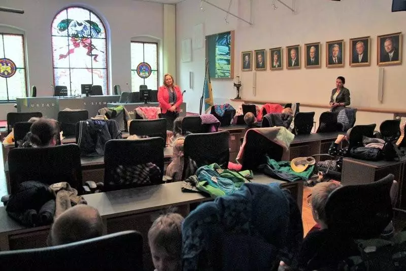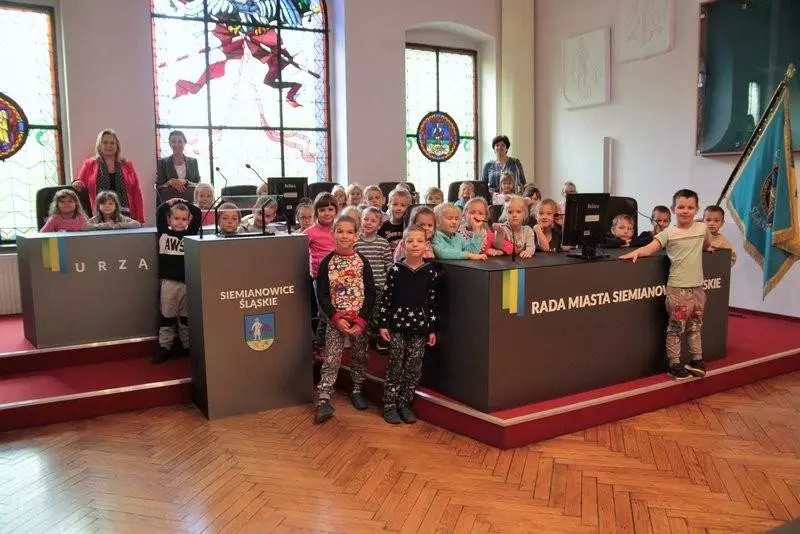Dzieci z Przedszkola nr 10 przyszły dzisiaj z sąsiedzką wizytą do Ratusza. Mali obywatele zobaczyli miejsce, w którym zapadają ważne dla miasta decyzje, a potem, kiedy rozsiedli się w sali sesyjnej, usłyszeli króciutko o tym, kto rządzi w Siemianowicach Śląskich i jak to się dzieje, że w mieście powstają place zabaw, nowe ulice i skwery.