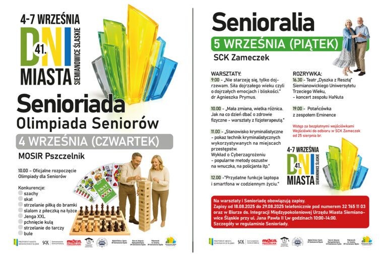 Na Senioriadę i warsztaty obowiązują zapisy od 18.08 do 29.08.2025 pod nr tel. 32 765 11 03 lub osobiście w Biurze ds. Integracji Międzypokoleniowej (Urząd Miasta, ul. Jana Pawła II 1, godz. 10:00–14:00).