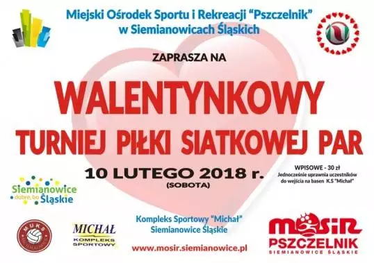 Już po raz szósty Miejski Ośrodek Sportu i Rekreacji „Pszczelnik” w Siemianowicach Śląskich organizuje Walentynkowy Turniej Piłki Siatkowej Par. W najbliższą sobotę (10.02.) w hali sportowej Kompleksu Sportowego „Michał” siatkarskie pary walczyć będą o zwycięstwo w kolejnej edycji imprezy.