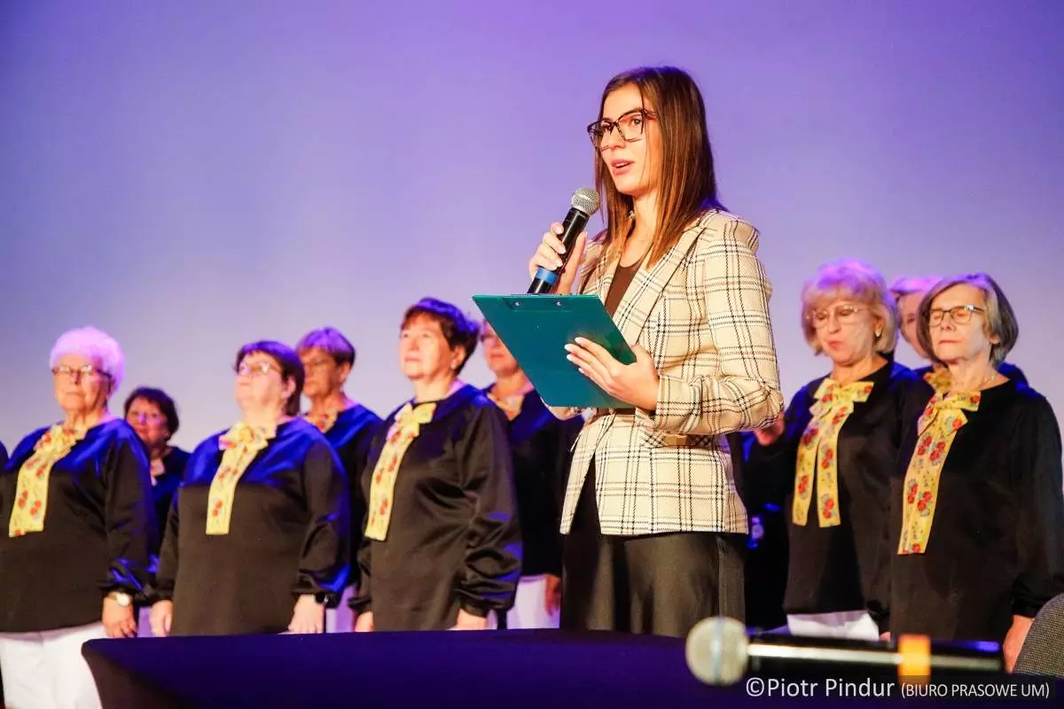 Julia Duras-Komar z Biura ds. Seniorów i Integracji Międzypokoleniowej wprowadziła zebranych w tematykę spotkania, po czym zapowiedziała występ chóru Siemianowickiego Uniwersytetu Trzeciego Wieku.