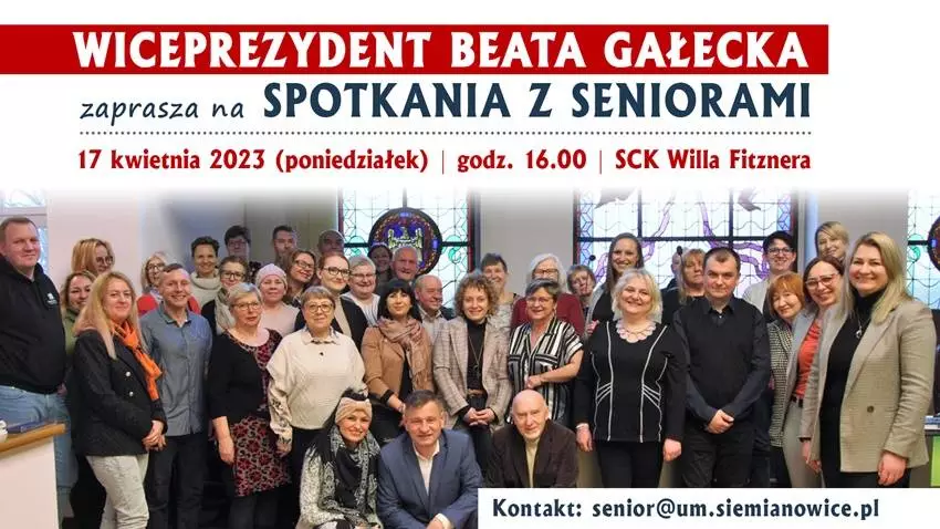 Zastępca Prezydenta Miasta Siemianowice Śląskie Beata Gałecka i Biuro ds. Seniorów zapraszają aktywnie działających lokalnie seniorów na spotkanie 17 kwietnia 2023 godz. 16.00, które odbędzie się w Willi Fitznera.
