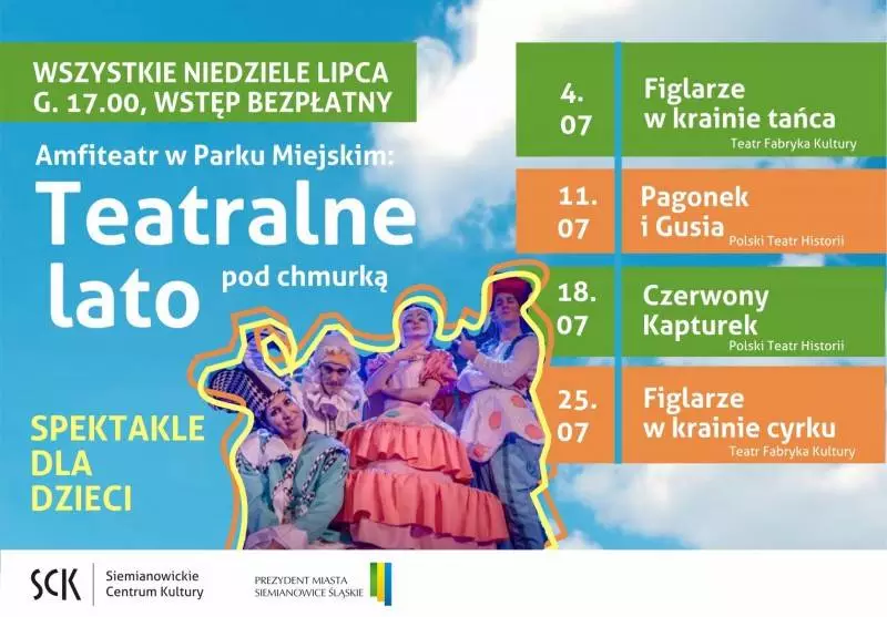 Jak co roku, w każdą lipcową niedzielę, Siemianowickie Centrum Kultury zaprasza najmłodszych wielbicieli teatru i ich rodziców do amfiteatru w siemianowickim Parku Miejskim na spektakle w ramach Teatralnego Lata pod Chmurką.