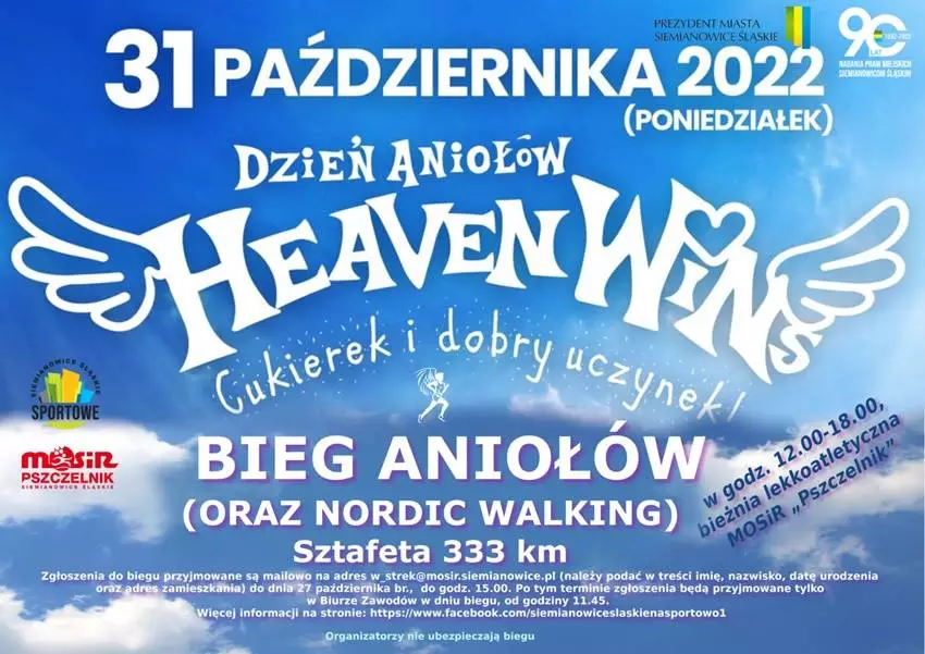 Wydział Kultury i Sportu Urzędu Miasta Siemianowice Śląskie oraz Miejski Ośrodek Sportu i Rekreacji "Pszczelnik” w Siemianowicach Śląskich zapraszają 31 października br. (poniedziałek) na BIEG ANIOŁÓW (ORAZ NORDIC WALKING) – Sztafeta 333 km.