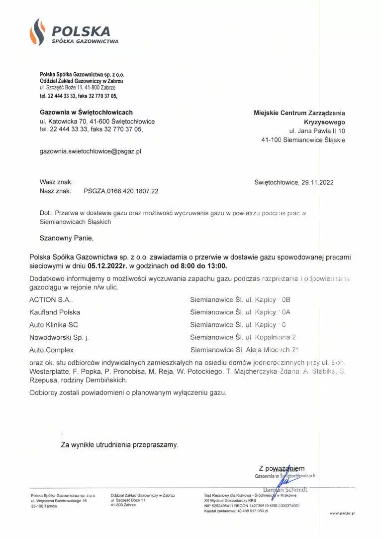 Miejskie Centrum Zarządzania Kryzysowego zawiadamia o możliwości pojawienia się zapachu gazu w najbliższy poniedziałek 5 grudnia.