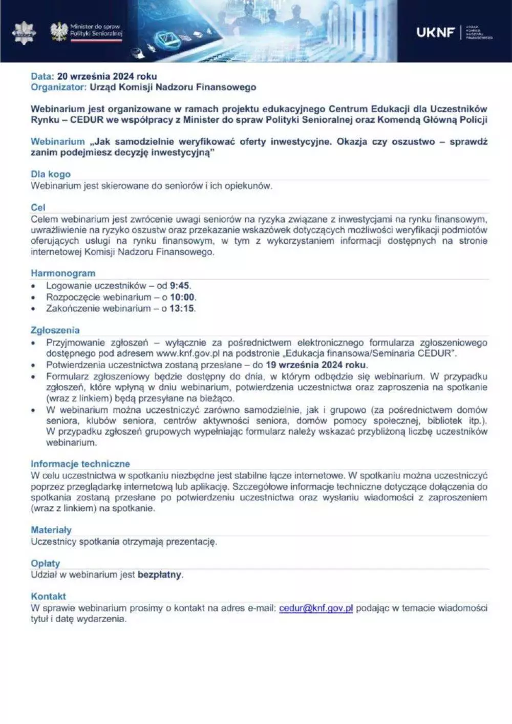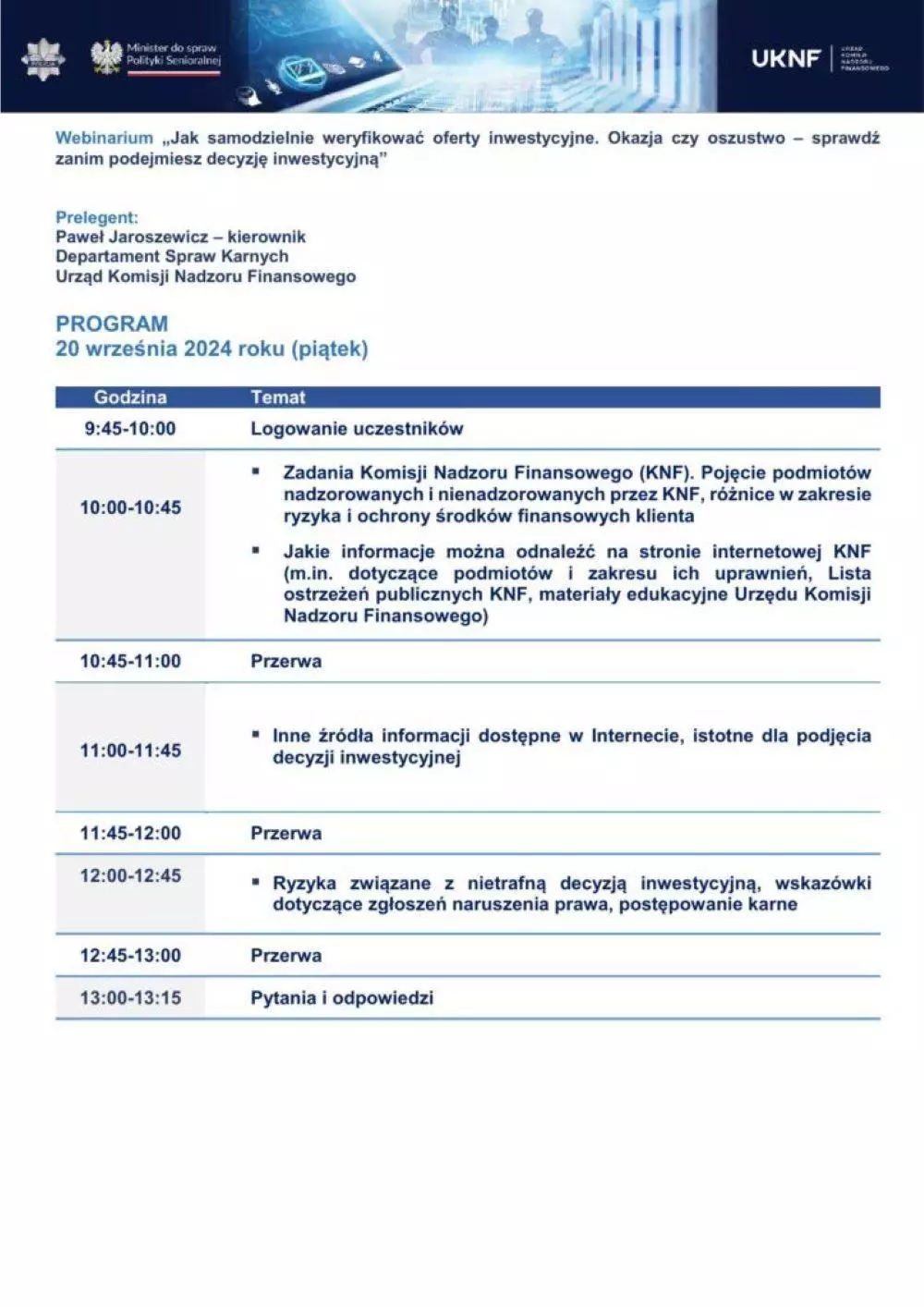 Celem webinarium jest zwrócenie uwagi seniorów na ryzyka związane z inwestycjami finansowymi, uświadomienie zagrożeń związanych z oszustwami oraz przedstawienie praktycznych wskazówek dotyczących weryfikacji ofert inwestycyjnych. Uczestnicy dowiedzą się, jak korzystać z informacji dostępnych na stronie internetowej Komisji Nadzoru Finansowego, aby podejmować świadome decyzje inwestycyjne.