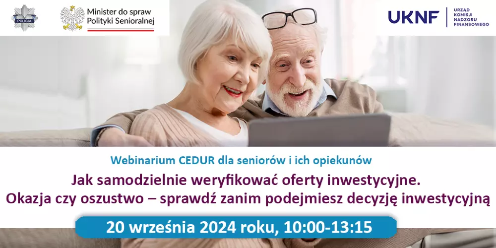 Pełnomocnik Wojewody Śląskiego do Spraw Polityki Senioralnej zaprasza seniorów i ich opiekunów na webinarium organizowane przez Urząd Komisji Nadzoru Finansowego, we współpracy z Ministerstwem ds. Polityki Senioralnej oraz Komendą Główną Policji.