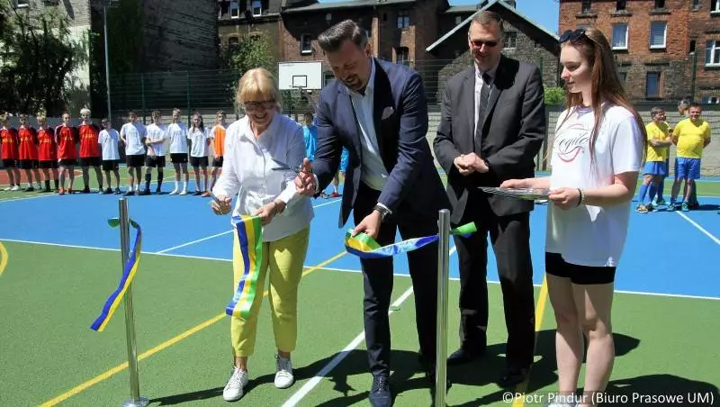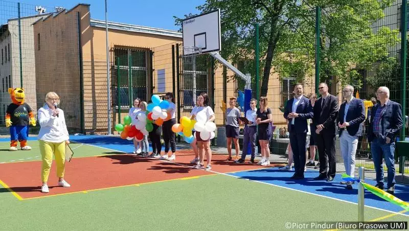 Uroczystość rozpoczęła pani dyrektor Danuta Kopyczok, witając wszystkich przybyłych gości, w tym prezydenta miasta Rafała Piecha, przewodniczącego Rady Miasta Adama Cebulę, naczelnika Wydziału Edukacji Annę Sobieraj, naczelnika Wydziału Kultury i Sportu Krzysztofa Nosa, absolwentów szkoły: dyrektora Zarządu MPGKiM Karola Termina i radnego Marcina Janotę. Po przedstawieniu przybyłych gości pani dyrektor serdecznie podziękowała wszystkim, którzy przyczynili się do powstania długo oczekiwanego boiska. Ten nowoczesny obiekt sportowy może być wykorzystywane do gry w piłkę siatkową, koszykową, nożną i ręczną. Jest on ponadto bardzo dobrze oświetlony, co daje możliwość korzystania z niego do późnych godzin wieczornych. Jest też na bieżąco monitorowany, dzięki czemu można się tam czuć naprawdę bezpiecznie.