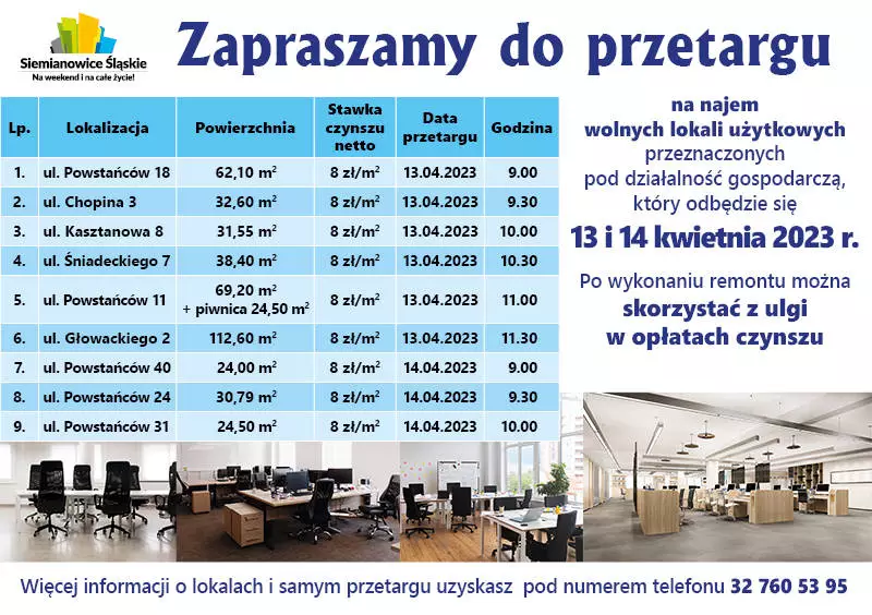 - ul. Powstańców 18 - Lokal użytkowy ma powierzchnię 62,10 m2. Stawką wywoławczą w przetargu jest miesięczna opłata czynszowa w wysokości 496,80 zł. Wadium w wysokości 20% rocznego czynszu wynosi 1 192,32 zł. Przetarg odbędzie się w dniu 13.04.2023 r. o godz. 9.00 na sali konferencyjnej w budynku Urzędu Miasta Siemianowice Śląskie przy ul. Michałkowickiej 105.