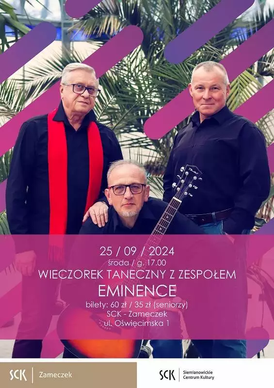 Po wakacyjnej przerwie zapraszamy wszystkich miłośników muzyki i tańca na wieczorek taneczny, który odbędzie się w SCK Zameczek 25 września 2024 roku o godzinie 17:00. Imprezę uświetni zespół „Eminence”, który zaprezentuje mix przebojów idealnych do tańca.