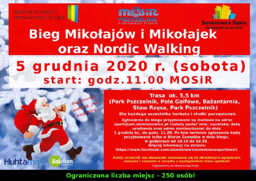 Impreza odbędzie się gdy obecne obostrzenia w zakresie organizacji wydarzeń biegowych, które w związku z sytuacją epidemiczną zostały wprowadzone czasowo do dnia 29.11.2020 r., zostaną po tym terminie zniesione. W innym przypadku tegoroczny "Bieg Mikołajów i Mikołajek oraz Nordic Walking" zostanie odwołany.