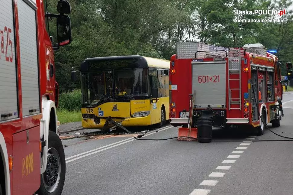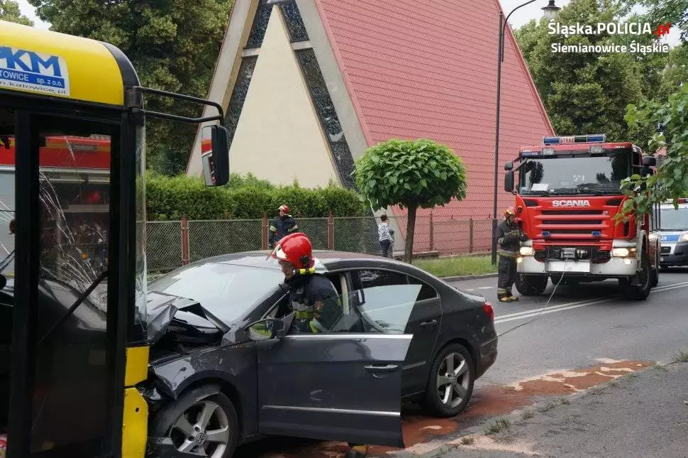 W prawidłowo jadący autobus komunikacji miejskiej wjechała czołowo osobówka. Kierująca volkswagenem została przetransportowana przez karetkę pogotowia ratunkowego do szpitala. Pomocy medycznej potrzebowali również pasażerowie autobusu. Kierowca autobusu i osobówki byli trzeźwi.