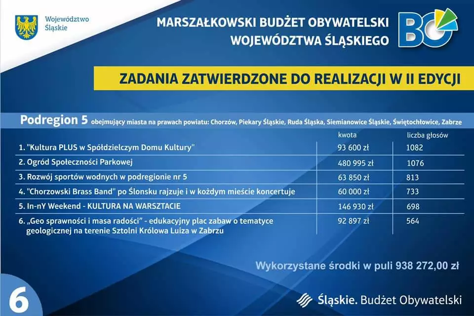 Listę zadań do realizacji w ramach II edycji Marszałkowskiego Budżetu Obywatelskiego zatwierdził Zarząd Województwa Śląskiego. Znajduje się na niej 40 zadań na łączną kwotę ponad 9 milionów złotych. Do realizacji zostały zatwierdzone: